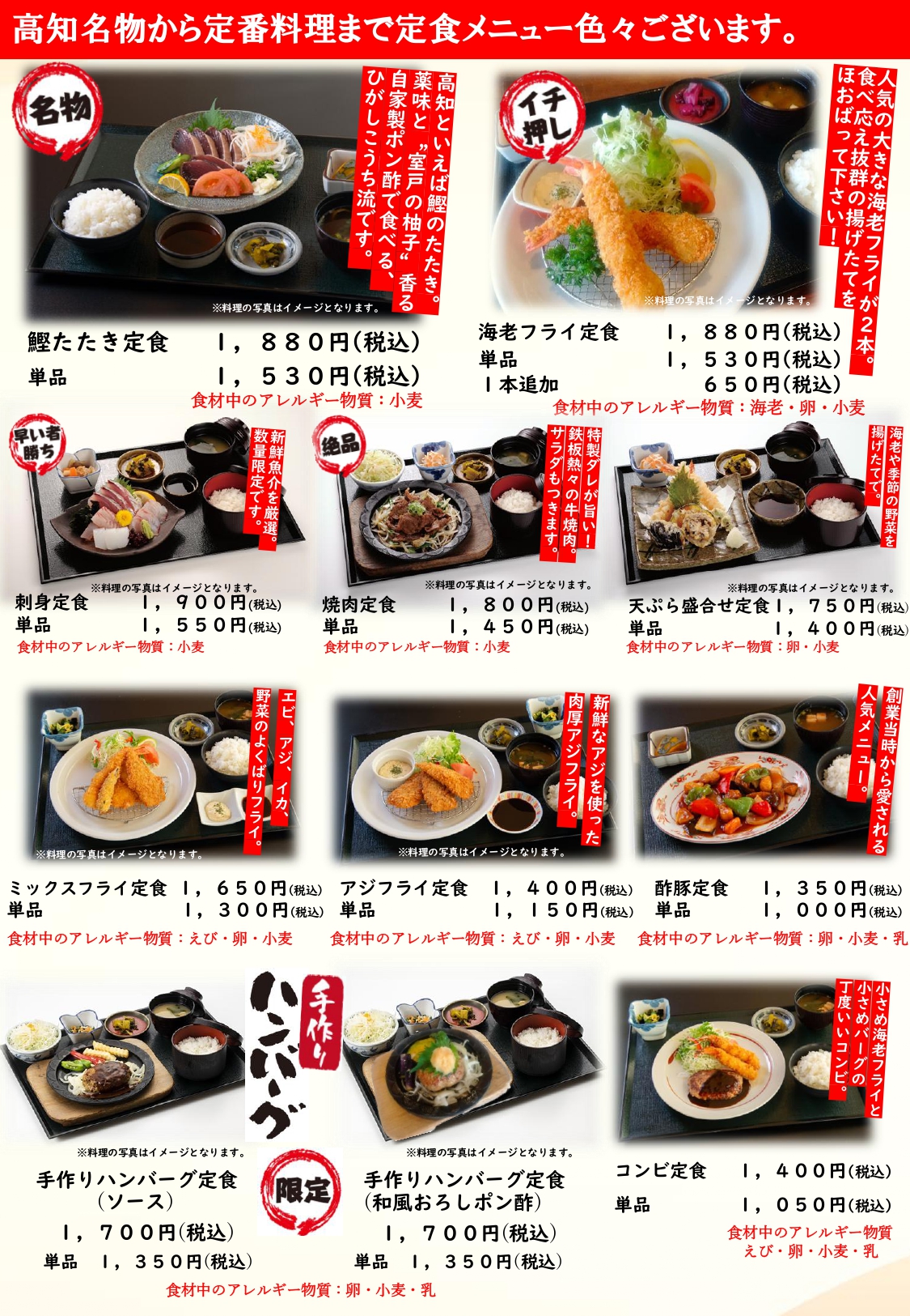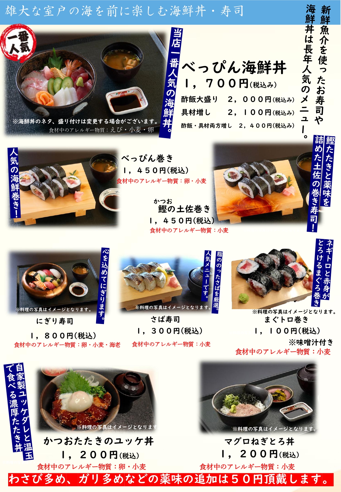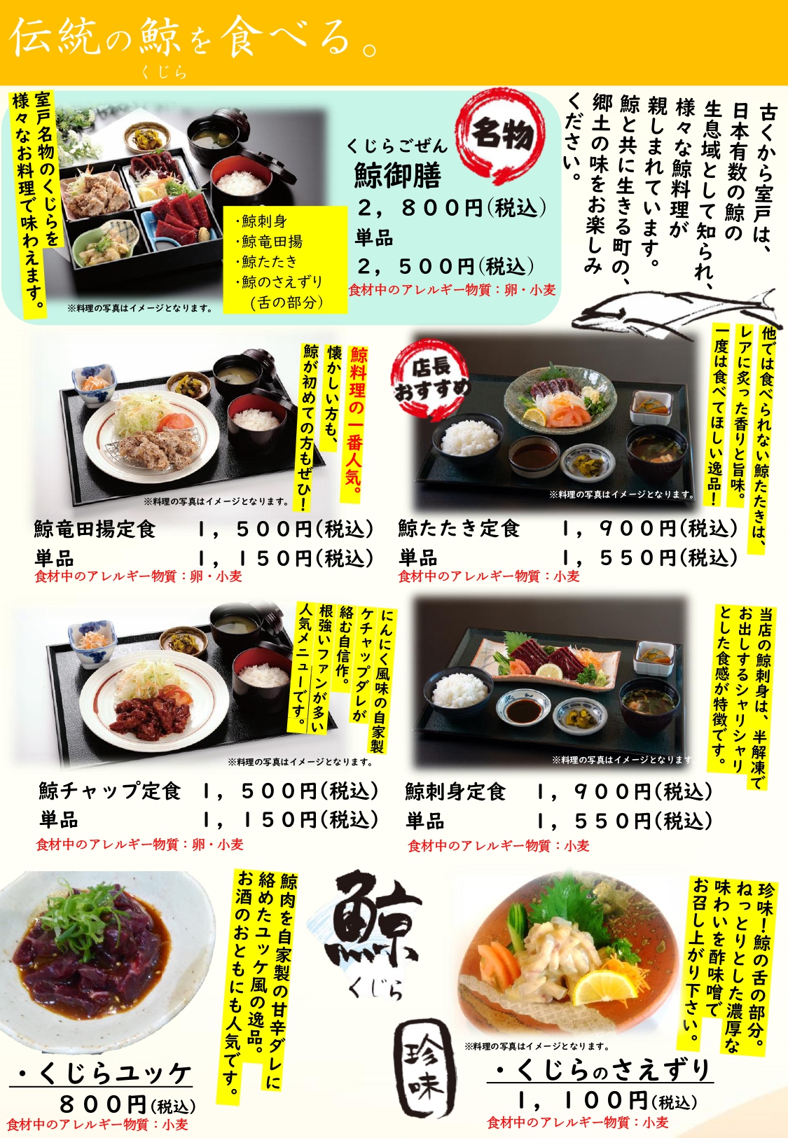 捕鯨で栄えた室戸伝統の鯨料理や一番人気の海鮮丼、お寿司等はもちろん、焼肉、エビフライ、鶏の唐揚げ、おうどんなど、ボリューム満点の定番メニューも揃えております。また季節の室戸食材を使った限定メニューや、法事、ツアー旅行等の団体様向け料理などもニーズに合わせてご用意いたします。