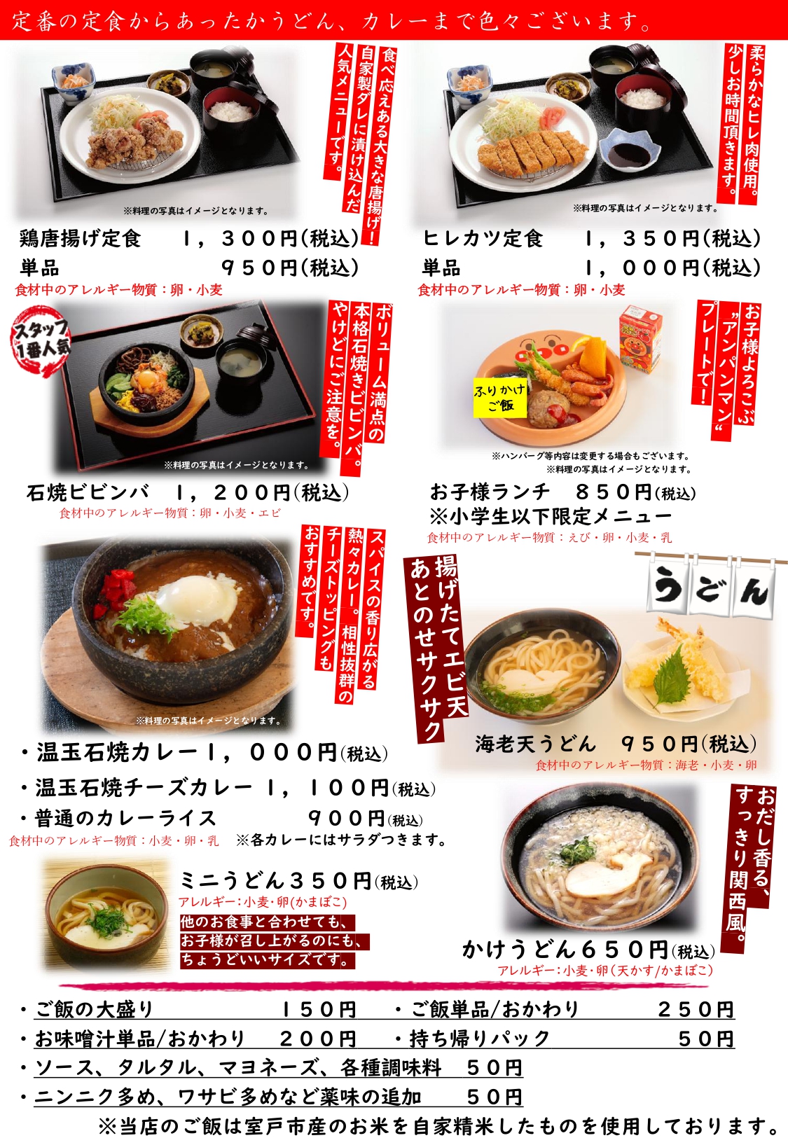 捕鯨で栄えた室戸伝統の鯨料理や一番人気の海鮮丼、お寿司等はもちろん、焼肉、エビフライ、鶏の唐揚げ、おうどんなど、ボリューム満点の定番メニューも揃えております。また季節の室戸食材を使った限定メニューや、法事、ツアー旅行等の団体様向け料理などもニーズに合わせてご用意いたします。